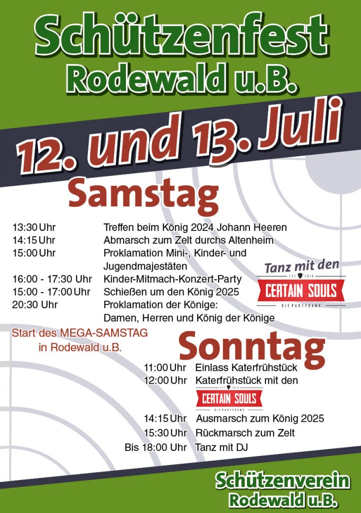 Am 12. und 13. Juli 2025 laden wir euch herzlich ein, gemeinsam mit uns zwei Tage voller guter Stimmung, Musik, Gemeinschaft und Tradition zu feiern – wie immer auf dem Schützenplatz Rodewald u/B.